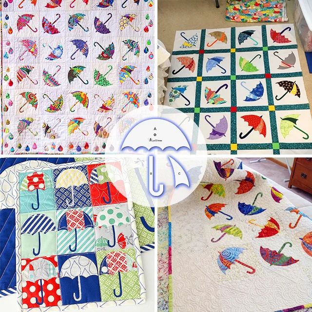 The more colorful your fabrics, the better the quilt will look. You can also use a layer cake that has light and dark background type fabrics. The umbrellas are attached using fusible applique.