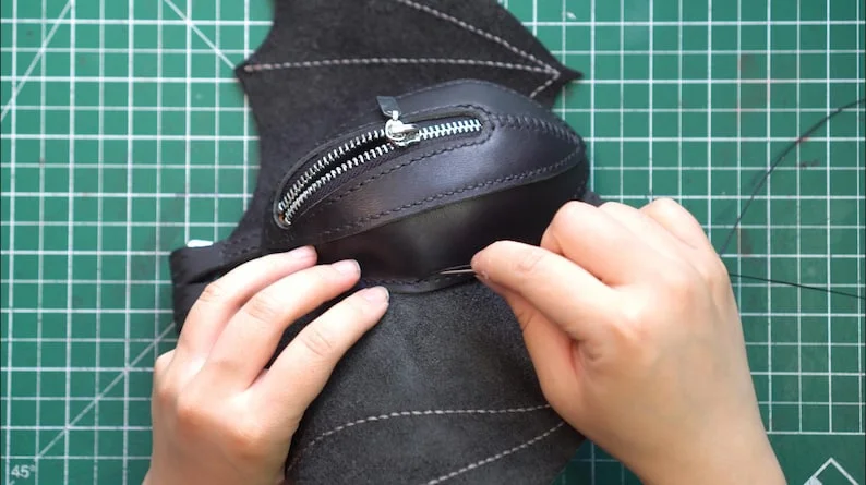 A few basics: oil tan leather, thread, zipper, swivel hook, and magnetic closure — that’s all it takes to bring your little leather bat to life!