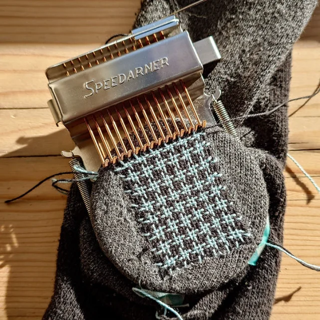 The Speedarner mending loom will help you create a 'patch' darn also known as surface darning - think of it like patching over a hole on a pair of jeans with a scrap of fabric. Your 'patch' darn will be stitched in place on all four sides and will cover the hole by floating over the surface.