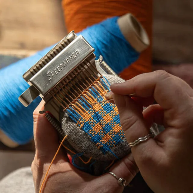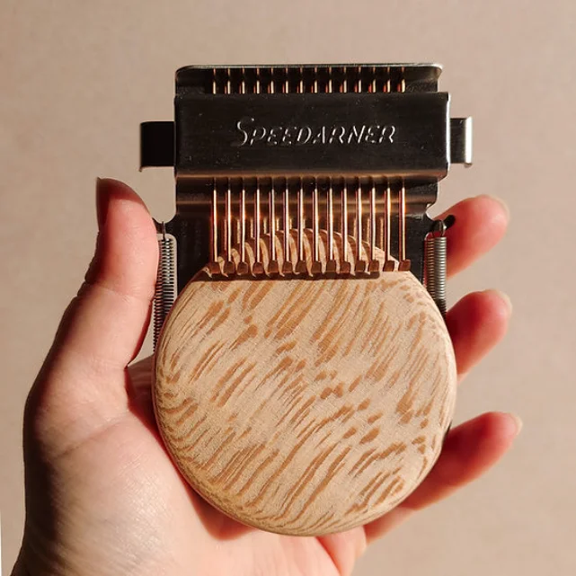 Discover the joy of mending your own clothes with the Speedarner - a creative repair loom that makes visible mending quicker and simpler than traditional freehand darning.With classic darning you have to concentrate on weaving over and under individual threads, but the Speedarner will do that part of the process for you. By simplifying the weaving process it makes mending more relaxing and enjoyable, especially for beginners.