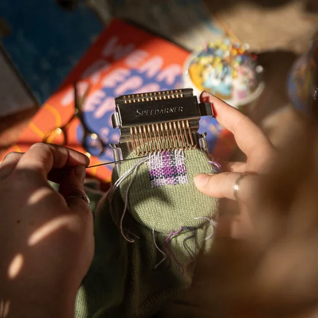 A carefully curated visible repair kit containing all the essential tools you need to start fixing your much-loved clothes with a Speedarner.![]()
